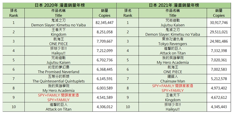 (資料來源:日本出版社-講談社、集英社官方公佈)