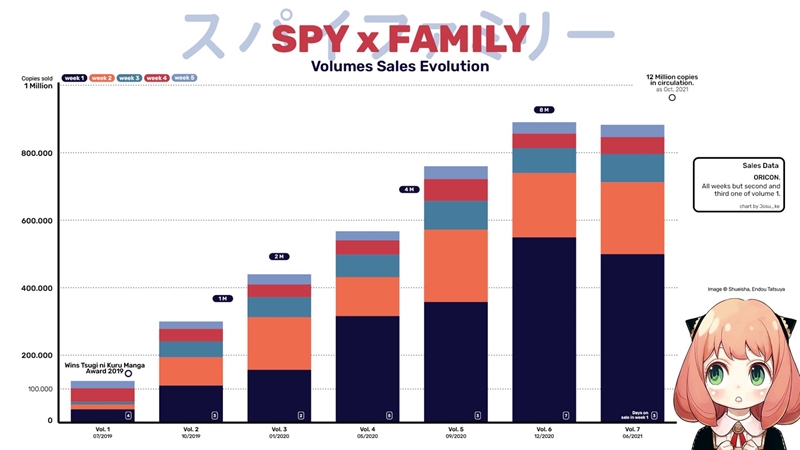 โดยถ้าเทียบยอดขายกับผลงานมังงะยอดนิยมของในหลายปีที่ผ่านมาอย่าง Kimetsu no Yaiba(ดาบพิฆาตอสูร) Attack on Titans ได้ยอดขายถึง 10 ล้านชุดตั้งแต่ออกหมายเลขเล่มที่ 9 โดยมียอดขายเฉลี่ยอยู่ที่ 1.1 ล้านก็อปปี้ต่อหนึ่งหมายเลขเล่ม มังงะ Kimetsu no Yaiba(ดาบพิฆาตอสูร) และในเวลาเดียวกัน Jujutsu Kaisen(มหาเวทย์ผนึกมาร) ก็ได้มียอดขายถึง 8.5 ก็อปปี้ตอนที่เริ่มตีพิมพ์ฉบับที่ 13 ด้วยจำนวนเฉลี่ย 650,000 ก็อปปี้ต่อหนึ่งฉบับ สำหรับ SPY x Family นั้นยอดขายเกิน 12.5 ล้านก็อปปี้ตั้งแต่ฉบับเล่มที่ 8 ตั้งแต่เดือน พฤศจิกายน 2021 ทำให้มียอดจำหน่ายเฉลี่ย 1.56 ล้านก็อปปี้ต่อหนึ่งหมายเลขเล่ม ด้วยยอดขายดาวรุ่งพุ่งแรงแบบนี้ ทำให้บรรดาเหล่าแฟน ๆ อดคาดหวังถึงความยอดเยี่ยมในการดัดแปลงเป็นอนิเมะไม่ได้จริง ๆ!
